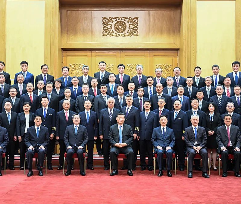 9月30日,黨和國家領(lǐng)導(dǎo)人習(xí)近平、韓正等在北京人民大會堂會見C919大型客機項目團隊代表并參觀項目成果展覽。這是習(xí)近平等會見C919大型客機項目團隊代表。新華社記者 丁林 攝