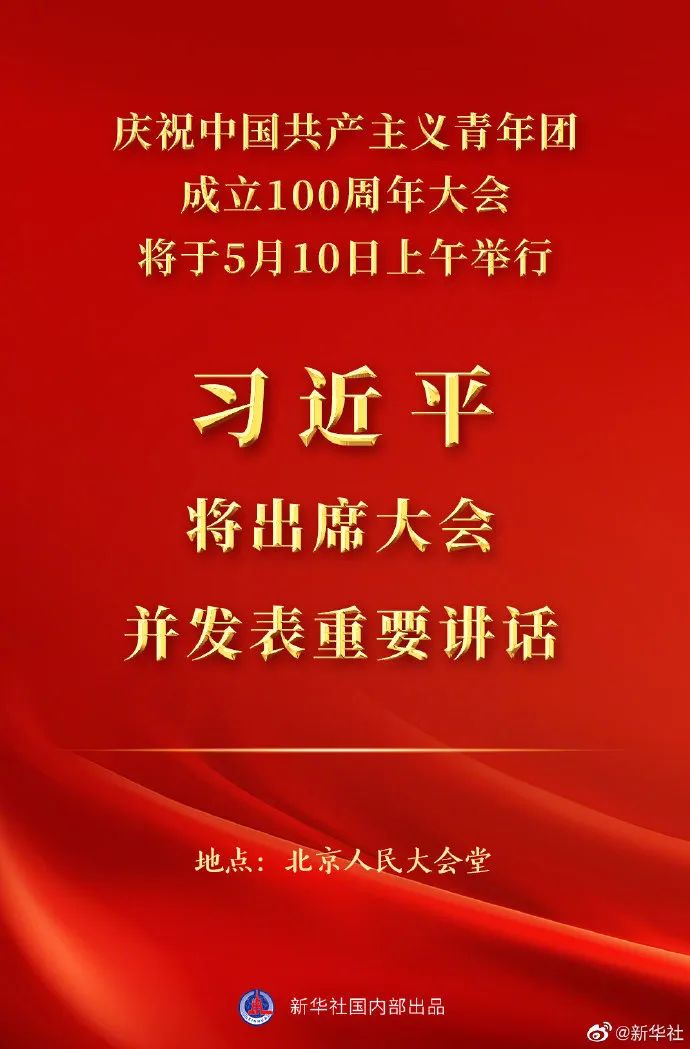 慶祝中國共產(chǎn)主義青年團成立100周年大會將于5月10日上午在北京人民大會堂隆重舉行。中共中央總書記、國家主席、中央軍委主席習(xí)近平將出席大會并發(fā)表重要講話。