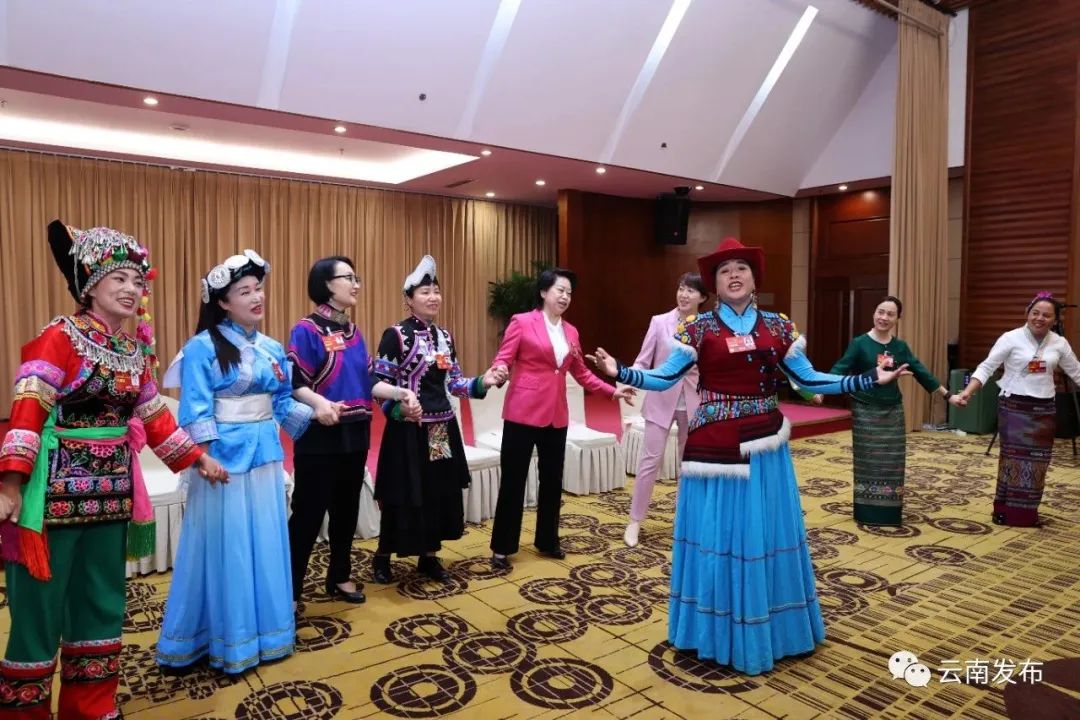 云南省代表團30位女代表、9位女工作人員、2位女記者中有29名少數民族同志,大家身著絢麗的民族服裝共同慶祝自己的節(jié)日,成為一道靚麗的風景線。女代表們一起唱起《唱支山歌給黨聽》等歌曲,歡樂的歌聲和燦爛的笑容充滿現場,傳遞著大家節(jié)日的喜悅心情和高漲的履職熱忱。