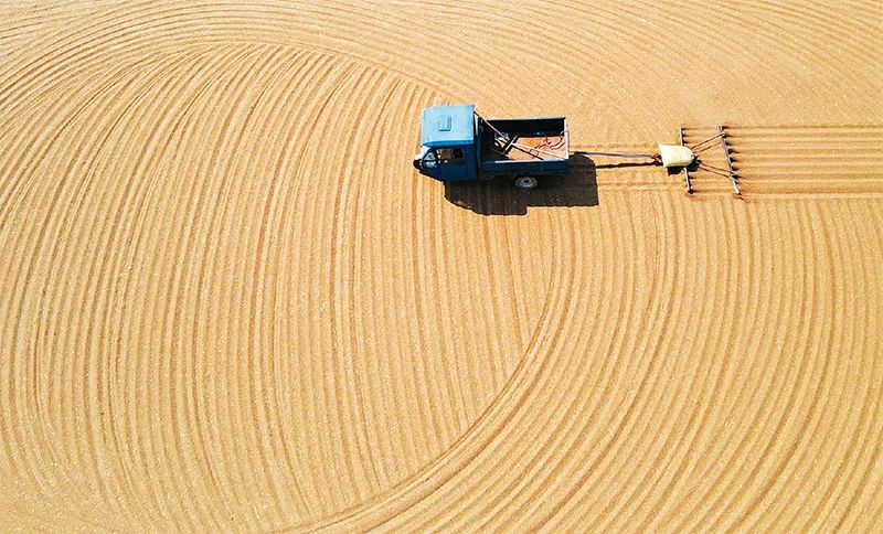 6月,正值小麥集中收獲時(shí)節(jié),各地農(nóng)民搶抓晴好天氣忙著收割、晾曬小麥,確保小麥顆粒歸倉(cāng)。圖為2023年6月9日,在江蘇省如皋市糧食儲(chǔ)備有限公司曬糧場(chǎng)上,工作人員用機(jī)械翻曬入庫(kù)的小麥。 新華社發(fā) 吳樹(shù)建/攝