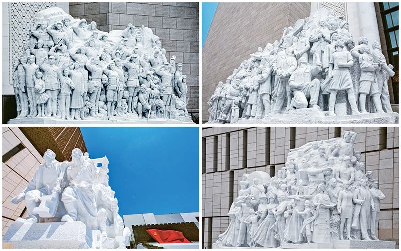 中國共產(chǎn)黨歷史展覽館西側(cè)廣場上矗立的《信仰》、《偉業(yè)》、《攻堅》、《追夢》四組大型雕塑,莊重巍然、充滿力量,講述著中國共產(chǎn)黨團結(jié)帶領(lǐng)全國各族人民艱苦奮斗、不懈奮斗的歷程。圖為四組大型雕塑拼版照片。 劉新武/攝