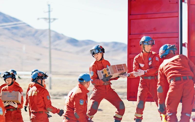 新時(shí)代以來(lái),廣大青年在搶險(xiǎn)救災(zāi)前線沖鋒陷陣,在黨和人民最需要的時(shí)刻沖得出來(lái)、頂?shù)蒙先?,展現(xiàn)出自信自強(qiáng)、剛健有為的精神風(fēng)貌。2025年1月7日,西藏自治區(qū)日喀則市定日縣發(fā)生6.8級(jí)地震。圖為1月9日西藏自治區(qū)森林消防總隊(duì)派出的救援人員在地震重災(zāi)區(qū)日喀則市拉孜縣拉孜鎮(zhèn)措布村卸載救災(zāi)物資。新華社記者 姜帆/攝