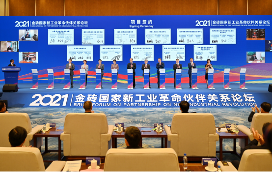 黨的十八大以來(lái),習(xí)近平總書(shū)記引領(lǐng)金磚合作開(kāi)啟構(gòu)建高質(zhì)量伙伴關(guān)系新征程。圖為2021年9月7日,在福建廈門舉行的2021金磚國(guó)家新工業(yè)革命伙伴關(guān)系論壇期間,金磚國(guó)家新工業(yè)革命伙伴關(guān)系創(chuàng)新基地舉行簽約儀式。新華社記者 林善傳/攝