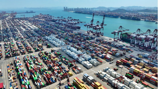 青島海關(guān)數(shù)據(jù)顯示,今年1月至5月,青島直達(dá)金磚國(guó)家的航線共完成箱量83萬(wàn)標(biāo)箱,同比增長(zhǎng)12%,其中出口量增長(zhǎng)26.1%。圖為繁忙的山東港口青島港前灣港區(qū),集裝箱貨輪在裝卸集裝箱(6月15日攝,無(wú)人機(jī)照片)。新華社記者 李紫恒 /攝