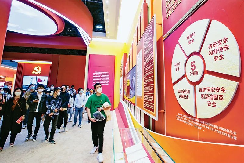 圖為2022年10月2日,觀眾在北京展覽館參觀“奮進(jìn)新時代”主題成就展第九單元“全面踐行總體國家安全觀 開創(chuàng)新時代國家安全新局面”展廳。 劉新武/攝
