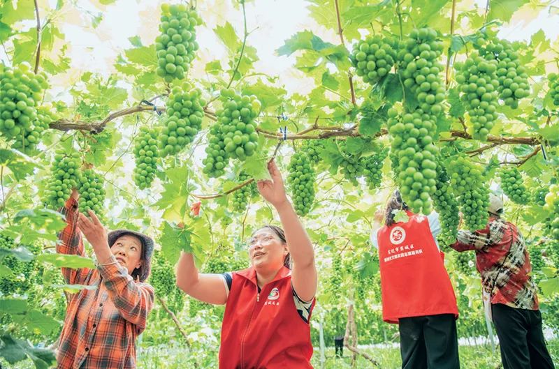 近年來,江蘇省宿遷市宿城區(qū)支口街道大力實(shí)施黨建引領(lǐng)強(qiáng)村富民工程,采取“黨建+合作社+農(nóng)戶”運(yùn)作模式,組織黨員志愿者走進(jìn)田間地頭生產(chǎn)一線,引導(dǎo)群眾因地制宜發(fā)展山楂、葡萄等特色產(chǎn)業(yè)種植,拓寬增收渠道,助力鄉(xiāng)村振興。圖為2023年6月30日,在宿遷市宿城區(qū)支口街道探楚社區(qū)葡萄種植基地,黨員志愿者和果農(nóng)一起管護(hù)葡萄。 人民圖片 徐江海/攝