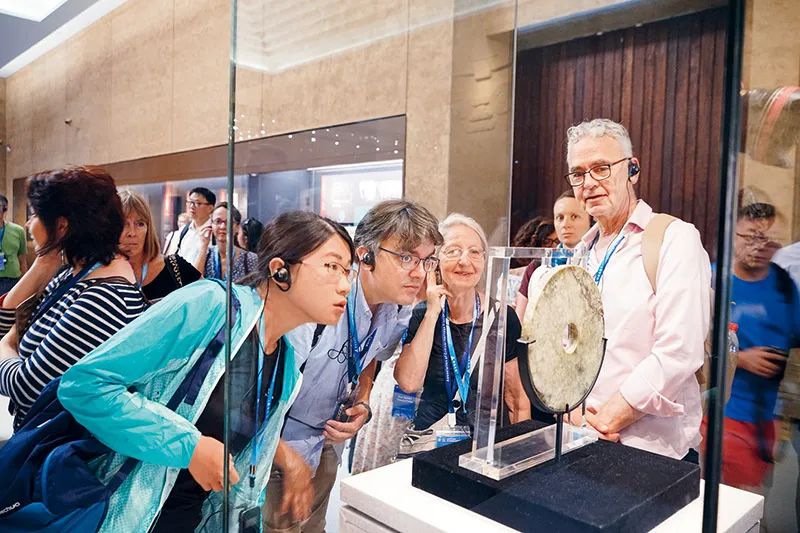圖為第四屆文化遺產(chǎn)世界大會期間國際專家學(xué)者參觀良渚博物院?!×间静┪镌汗﹫D