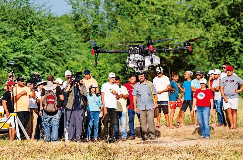 圖為2024年2月2日,在巴西阿波迪舉行的中巴農(nóng)業(yè)機(jī)械化合作示范項目啟動儀式上,人們觀看一款中國生產(chǎn)的農(nóng)用無人機(jī)。新華社記者 王天聰/攝