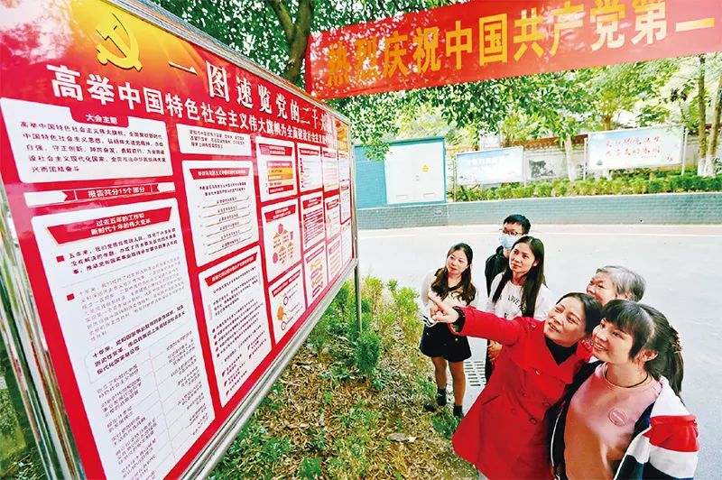 ?圖為2022年10月18日,重慶市萬盛經(jīng)開區(qū)東林街道清溪橋社區(qū),剛剛制作好的黨的二十大宣傳展板吸引了不少居民駐足閱覽,熱議并學習黨的二十大報告。 視覺中國 王瀘州/攝