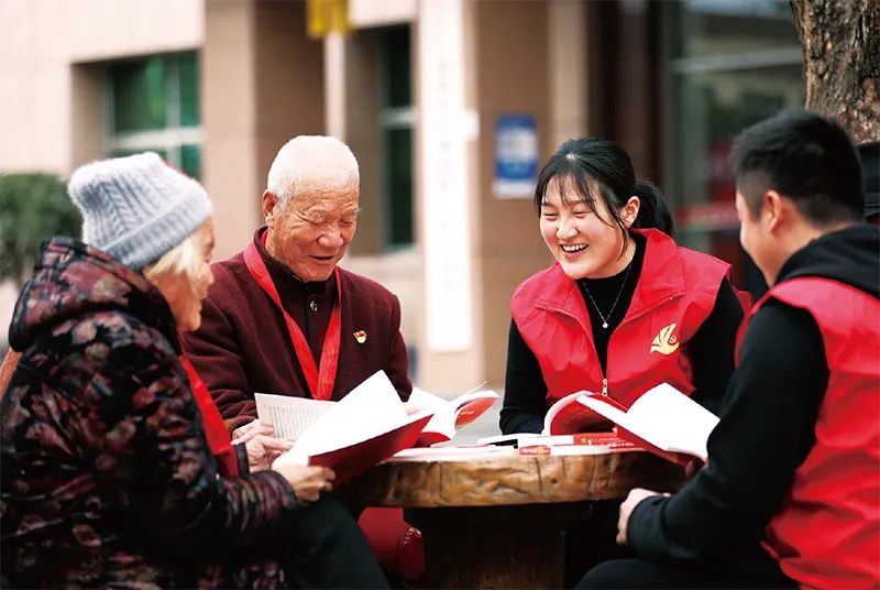 ?圖為2022年11月18日,山東省臨沂市郯城縣郯城街道“90后”青年黨員志愿者與龍泉社區(qū)“40后”老黨員一起學習黨的二十大精神。 人民圖片 張春雷/攝