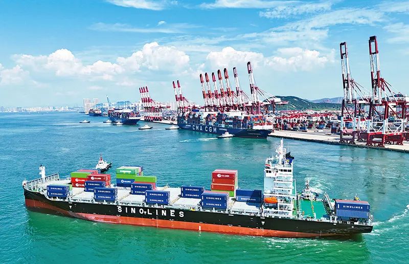 以開(kāi)放促改革、促發(fā)展是我國(guó)現(xiàn)代化建設(shè)不斷取得新成就的重要法寶。圖為2023年8月30日,“中外運(yùn)海口”輪緩緩駛離青島港,駛向印度欽奈港。2023年以來(lái),青島港“一帶一路”國(guó)家和地區(qū)箱量保持兩位數(shù)增長(zhǎng)。 新華社發(fā) 張進(jìn)剛/攝