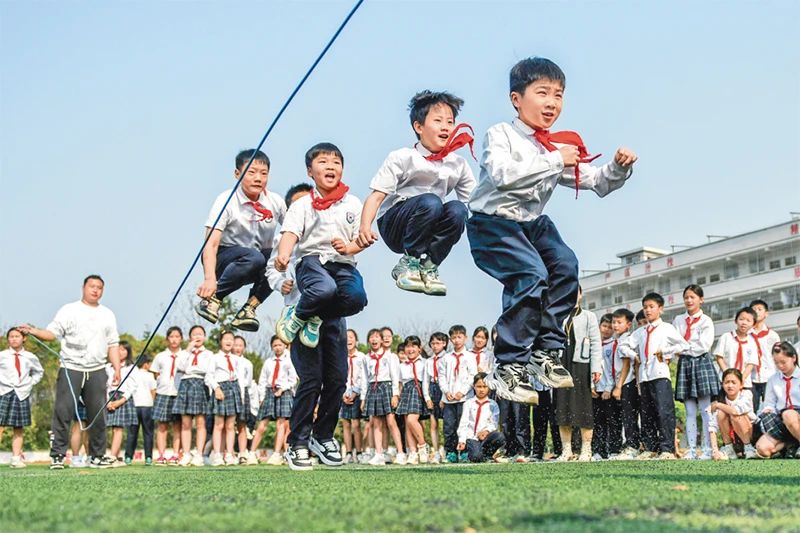 近年來,各地中小學(xué)積極落實“健康第一”教育理念,實施學(xué)生體質(zhì)強健計劃,讓學(xué)生更加健康、陽光、自信地成長。圖為2025年3月25日,湖南省永州市道縣朝陽小學(xué),學(xué)生們在課間跳長繩。 人民圖片 蔣克青/攝