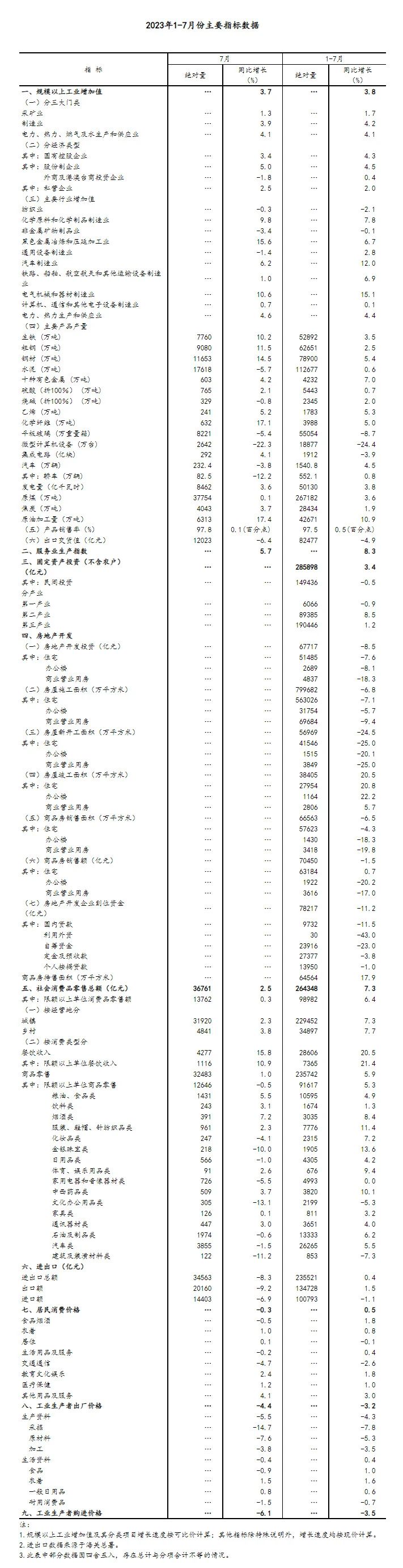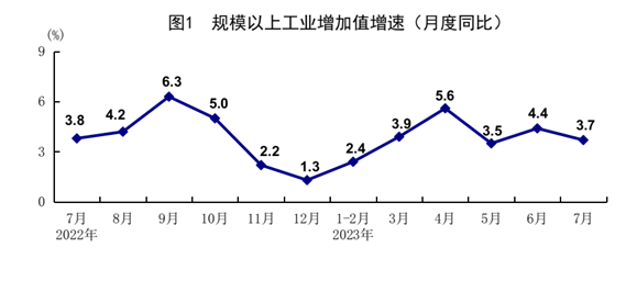 7月份,全國規(guī)模以上工業(yè)增加值同比增長3.7%,環(huán)比增長0.01%。分三大門類看,采礦業(yè)增加值同比增長1.3%,制造業(yè)增長3.9%,電力、熱力、燃?xì)饧八a(chǎn)和供應(yīng)業(yè)增長4.1%。原材料制造業(yè)增加值同比增長8.8%,比上月加快2.0個(gè)百分點(diǎn)。分經(jīng)濟(jì)類型看,國有控股企業(yè)增加值同比增長3.4%;股份制企業(yè)增長5.0%,外商及港澳臺(tái)商投資企業(yè)下降1.8%;私營企業(yè)增長2.5%。分產(chǎn)品看,太陽能電池、新能源汽車產(chǎn)品產(chǎn)量同比分別增長65.1%、24.9%。1-7月份,全國規(guī)模以上工業(yè)增加值同比增長3.8%。7月份,制造業(yè)采購經(jīng)理指數(shù)為49.3%,企業(yè)生產(chǎn)經(jīng)營活動(dòng)預(yù)期指數(shù)為55.1%。