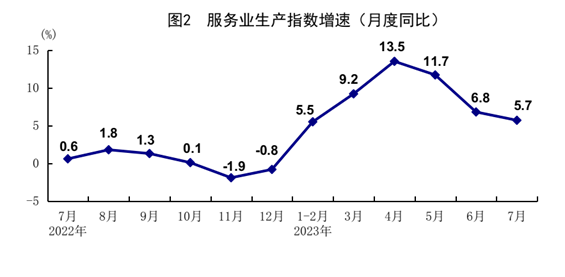7月份,全國服務(wù)業(yè)生產(chǎn)指數(shù)同比增長5.7%。分行業(yè)看,住宿和餐飲業(yè),信息傳輸、軟件和信息技術(shù)服務(wù)業(yè),金融業(yè),交通運(yùn)輸、倉儲(chǔ)和郵政業(yè)生產(chǎn)指數(shù)同比分別增長20.0%、11.2%、7.6%、7.3%。1-7月份,全國服務(wù)業(yè)生產(chǎn)指數(shù)同比增長8.3%。1-6月份,規(guī)模以上服務(wù)業(yè)企業(yè)營業(yè)收入同比增長7.5%。7月份,服務(wù)業(yè)商務(wù)活動(dòng)指數(shù)為51.5%,業(yè)務(wù)活動(dòng)預(yù)期指數(shù)為58.7%,其中,航空運(yùn)輸、郵政快遞、電信廣播電視及衛(wèi)星傳輸服務(wù)、互聯(lián)網(wǎng)軟件及信息技術(shù)服務(wù)等行業(yè)商務(wù)活動(dòng)指數(shù)位于60%以上高位景氣區(qū)間。