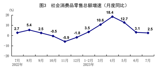 7月份,社會(huì)消費(fèi)品零售總額36761億元,同比增長2.5%,環(huán)比下降0.06%。按經(jīng)營單位所在地分,城鎮(zhèn)消費(fèi)品零售額31920億元,同比增長2.3%;鄉(xiāng)村消費(fèi)品零售額4841億元,增長3.8%。按消費(fèi)類型分,商品零售32483億元,增長1.0%;餐飲收入4277億元,增長15.8%。在限額以上單位商品零售額中,糧油、食品類,中西藥品類,飲料類,通訊器材類商品零售額分別增長5.5%、3.7%、3.1%、3.0%。1-7月份,社會(huì)消費(fèi)品零售總額264348億元,同比增長7.3%。全國網(wǎng)上零售額83097億元,同比增長12.5%。其中,實(shí)物商品網(wǎng)上零售額69856億元,增長10.0%,占社會(huì)消費(fèi)品零售總額的比重為26.4%。1-7月份,服務(wù)零售額同比增長20.3%。