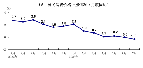 7月份,全國居民消費(fèi)價(jià)格(CPI)同比下降0.3%,環(huán)比上漲0.2%。分類別看,食品煙酒價(jià)格同比下降0.5%,衣著價(jià)格上漲1.0%,居住價(jià)格上漲0.1%,生活用品及服務(wù)價(jià)格下降0.2%,交通通信價(jià)格下降4.7%,教育文化娛樂價(jià)格上漲2.4%,醫(yī)療保健價(jià)格上漲1.2%,其他用品及服務(wù)價(jià)格上漲4.1%。在食品煙酒價(jià)格中,豬肉價(jià)格下降26.0%,鮮菜價(jià)格下降1.5%,糧食價(jià)格上漲0.3%,鮮果價(jià)格上漲5.0%??鄢称泛湍茉磧r(jià)格后的核心CPI同比上漲0.8%,漲幅比上月擴(kuò)大0.4個(gè)百分點(diǎn)。1-7月份,全國居民消費(fèi)價(jià)格同比上漲0.5%。