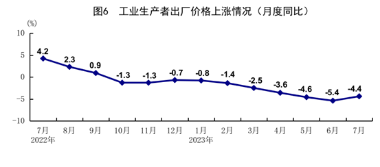 7月份,全國工業(yè)生產(chǎn)者出廠價(jià)格同比下降4.4%,降幅比上月收窄1.0個(gè)百分點(diǎn);環(huán)比下降0.2%。全國工業(yè)生產(chǎn)者購進(jìn)價(jià)格同比下降6.1%,降幅比上月收窄0.4個(gè)百分點(diǎn);環(huán)比下降0.5%。1-7月份,全國工業(yè)生產(chǎn)者出廠價(jià)格和購進(jìn)價(jià)格同比分別下降3.2%和3.5%。