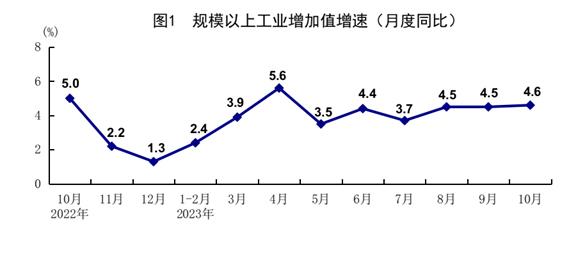 10月份,全國規(guī)模以上工業(yè)增加值同比增長4.6%,比上月加快0.1個百分點;環(huán)比增長0.39%。分三大門類看,采礦業(yè)增加值同比增長2.9%,制造業(yè)增長5.1%,電力、熱力、燃氣及水生產和供應業(yè)增長1.5%。裝備制造業(yè)增加值同比增長6.2%,比上月加快0.7個百分點,連續(xù)3個月回升。分經濟類型看,國有控股企業(yè)增加值同比增長4.9%;股份制企業(yè)增長5.6%,外商及港澳臺商投資企業(yè)增長0.9%;私營企業(yè)增長3.9%。分產品看,太陽能電池、服務機器人、集成電路產品產量同比分別增長62.8%、59.1%、34.5%。1-10月份,全國規(guī)模以上工業(yè)增加值同比增長4.1%。1-9月份,全國規(guī)模以上工業(yè)企業(yè)實現(xiàn)利潤總額同比下降9.0%,降幅比1-8月份收窄2.7個百分點,其中9月份同比增長11.9%。10月份,制造業(yè)采購經理指數為49.5%,企業(yè)生產經營活動預期指數為55.6%。