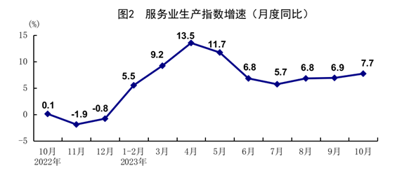 10月份,全國服務業(yè)生產指數同比增長7.7%,比上月加快0.8個百分點。分行業(yè)看,住宿和餐飲業(yè),交通運輸、倉儲和郵政業(yè),信息傳輸、軟件和信息技術服務業(yè),批發(fā)和零售業(yè),金融業(yè)生產指數同比分別增長21.3%、13.2%、10.9%、10.0%、7.8%。1-10月份,全國服務業(yè)生產指數同比增長7.9%。1-9月份,規(guī)模以上服務業(yè)企業(yè)營業(yè)收入同比增長7.1%。10月份,服務業(yè)商務活動指數為50.1%,業(yè)務活動預期指數為57.5%,其中,鐵路運輸、航空運輸、郵政、電信廣播電視及衛(wèi)星傳輸服務等行業(yè)商務活動指數位于60.0%以上高位景氣區(qū)間。