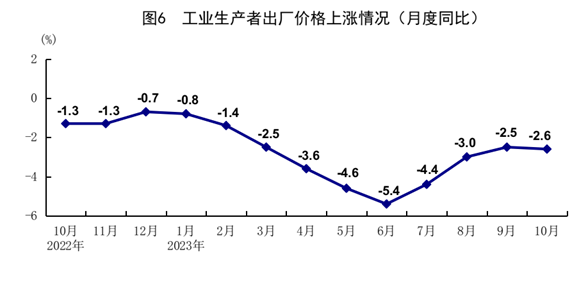 10月份,全國工業(yè)生產者出廠價格同比下降2.6%,環(huán)比持平。全國工業(yè)生產者購進價格同比下降3.7%,環(huán)比上漲0.2%。1-10月份,全國工業(yè)生產者出廠價格和購進價格同比分別下降3.1%和3.6%。