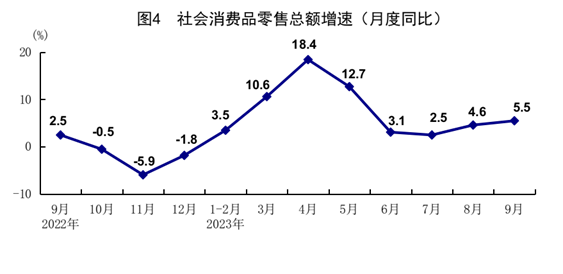 前三季度,社會消費品零售總額342107億元,同比增長6.8%。按經營單位所在地分,城鎮(zhèn)消費品零售額296410億元,同比增長6.7%;鄉(xiāng)村消費品零售額45697億元,增長7.4%。按消費類型分,商品零售305002億元,增長5.5%;餐飲收入37105億元,增長18.7%?;旧铑惿唐蜂N售穩(wěn)定增長,限額以上單位服裝鞋帽針紡織品類、糧油食品類商品零售額分別增長10.6%、5.3%。升級類商品銷售較快增長,限額以上單位金銀珠寶類、體育娛樂用品類、化妝品類商品零售額分別增長12.2%、8.3%、6.8%。全國網上零售額108198億元,同比增長11.6%。其中,實物商品網上零售額90435億元,增長8.9%,占社會消費品零售總額的比重為26.4%。9月份,社會消費品零售總額同比增長5.5%,比上月加快0.9個百分點,增速連續(xù)2個月加快;環(huán)比增長0.02%。前三季度,服務零售額同比增長18.9%。