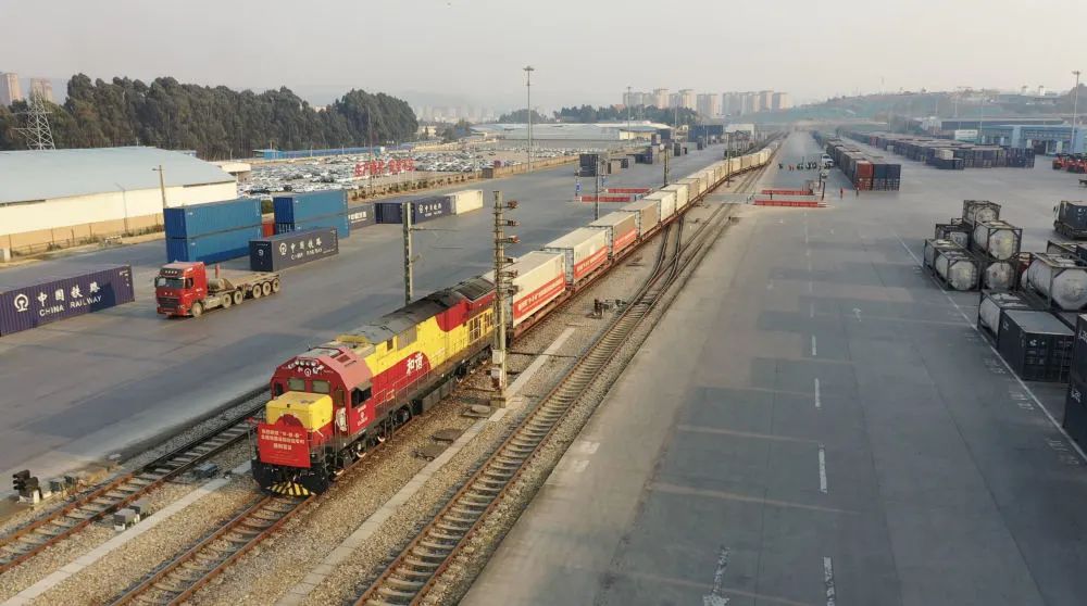 中老鐵路國際貨物列車從中鐵聯(lián)集昆明中心站駛出。圖源:新華社