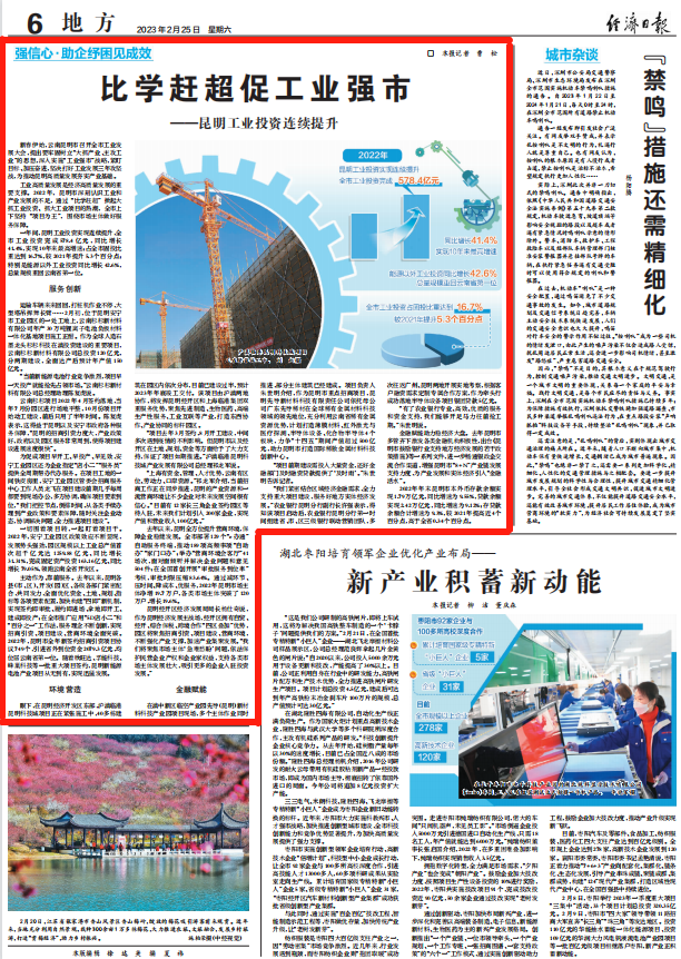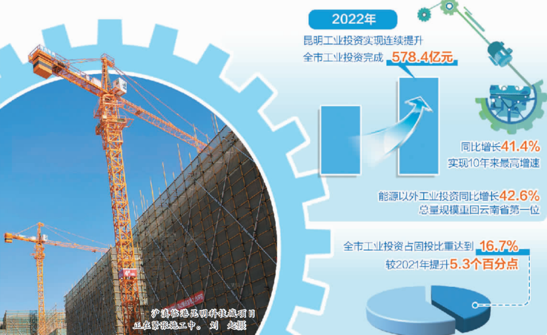 一年間,昆明工業(yè)投資實(shí)現(xiàn)連續(xù)提升,全市工業(yè)投資完成578.4億元,同比增長(zhǎng)41.4%,實(shí)現(xiàn)10年來(lái)最高增速;占全市固投比重達(dá)到16.7%,較2021年提升5.3個(gè)百分點(diǎn);特別是能源以外工業(yè)投資同比增長(zhǎng)42.6%,總量規(guī)模重回云南省第一位。