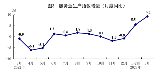一季度,服務(wù)業(yè)增加值同比增長5.4%,比上年四季度加快3.1個(gè)百分點(diǎn)。其中,住宿和餐飲業(yè),信息傳輸、軟件和信息技術(shù)服務(wù)業(yè),金融業(yè),租賃和商務(wù)服務(wù)業(yè),批發(fā)和零售業(yè)增加值分別增長13.6%、11.2%、6.9%、6.0%、5.5%。3月份,全國服務(wù)業(yè)生產(chǎn)指數(shù)同比增長9.2%,比1-2月份加快3.7個(gè)百分點(diǎn)。其中,住宿和餐飲業(yè),信息傳輸、軟件和信息技術(shù)服務(wù)業(yè),交通運(yùn)輸、倉儲(chǔ)和郵政業(yè)生產(chǎn)指數(shù)分別增長29.9%、12.0%、11.9%,比1-2月份分別加快18.3、2.7、7.7個(gè)百分點(diǎn)。1-2月份,規(guī)模以上服務(wù)業(yè)企業(yè)營業(yè)收入同比增長3.4%。3月份,服務(wù)業(yè)商務(wù)活動(dòng)指數(shù)為56.9%,業(yè)務(wù)活動(dòng)預(yù)期指數(shù)為63.2%。其中,零售、鐵路運(yùn)輸、道路運(yùn)輸、航空運(yùn)輸、租賃及商務(wù)服務(wù)等行業(yè)商務(wù)活動(dòng)指數(shù)高于60.0%。