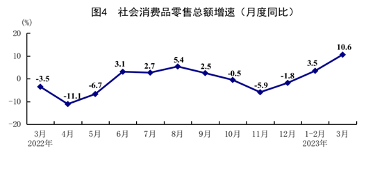 一季度,社會(huì)消費(fèi)品零售總額114922億元,同比增長5.8%,上年四季度為下降2.7%。按經(jīng)營單位所在地分,城鎮(zhèn)消費(fèi)品零售額99664億元,增長5.7%;鄉(xiāng)村消費(fèi)品零售額15258億元,增長6.2%。按消費(fèi)類型分,商品零售102786億元,增長4.9%;餐飲收入12136億元,增長13.9%。基本生活類商品銷售良好,限額以上單位服裝鞋帽針紡織品類、糧油食品類商品零售額分別增長9.0%、7.5%。升級(jí)類商品銷售大幅增長,限額以上單位金銀珠寶類、書報(bào)雜志類商品零售額分別增長13.6%、13.4%。全國網(wǎng)上零售額32863億元,增長8.6%。其中,實(shí)物商品網(wǎng)上零售額27835億元,增長7.3%,占社會(huì)消費(fèi)品零售總額的比重為24.2%。3月份,社會(huì)消費(fèi)品零售總額同比增長10.6%,比1-2月份加快7.1個(gè)百分點(diǎn);環(huán)比增長0.15%。
